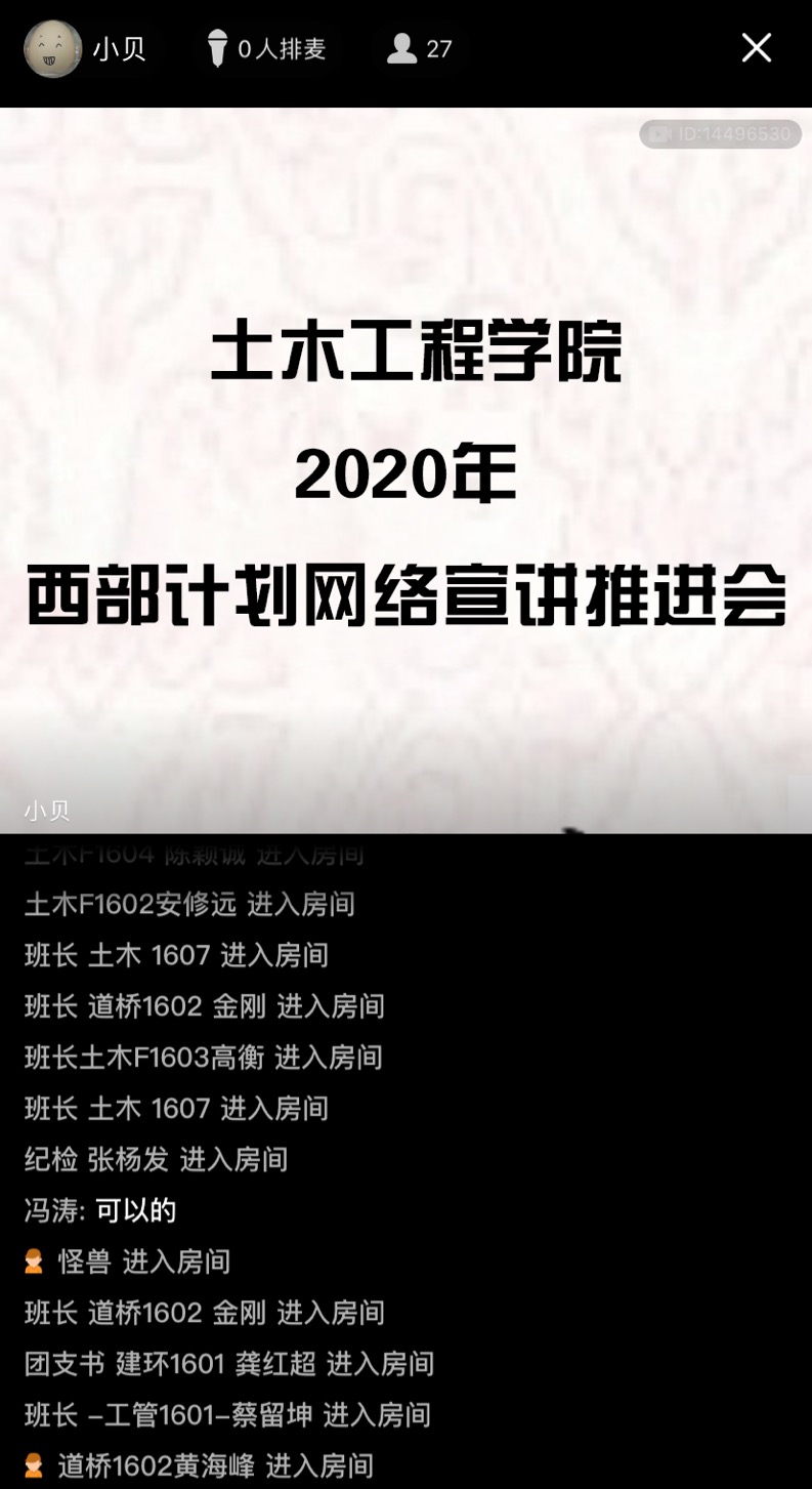 宣讲过程中,周贝贝向与会同学详细介绍了西部计划和河南省大学生志愿服务贫困县计划的项目实施情况、报名流程、补贴待遇和相关优惠政策。接着,他结合自身支教经历、驻村经历,讲解了国家实施西部计划的重大意义,他要求各班班长、团支书认真学习领会此次线上动员推进会精神,及时将相关要求传达给班级每一名同学,在尊重学生选择的基础上积极动员班级同学到西部去,到国家最需要的地方去建功立业、展示青春风采。