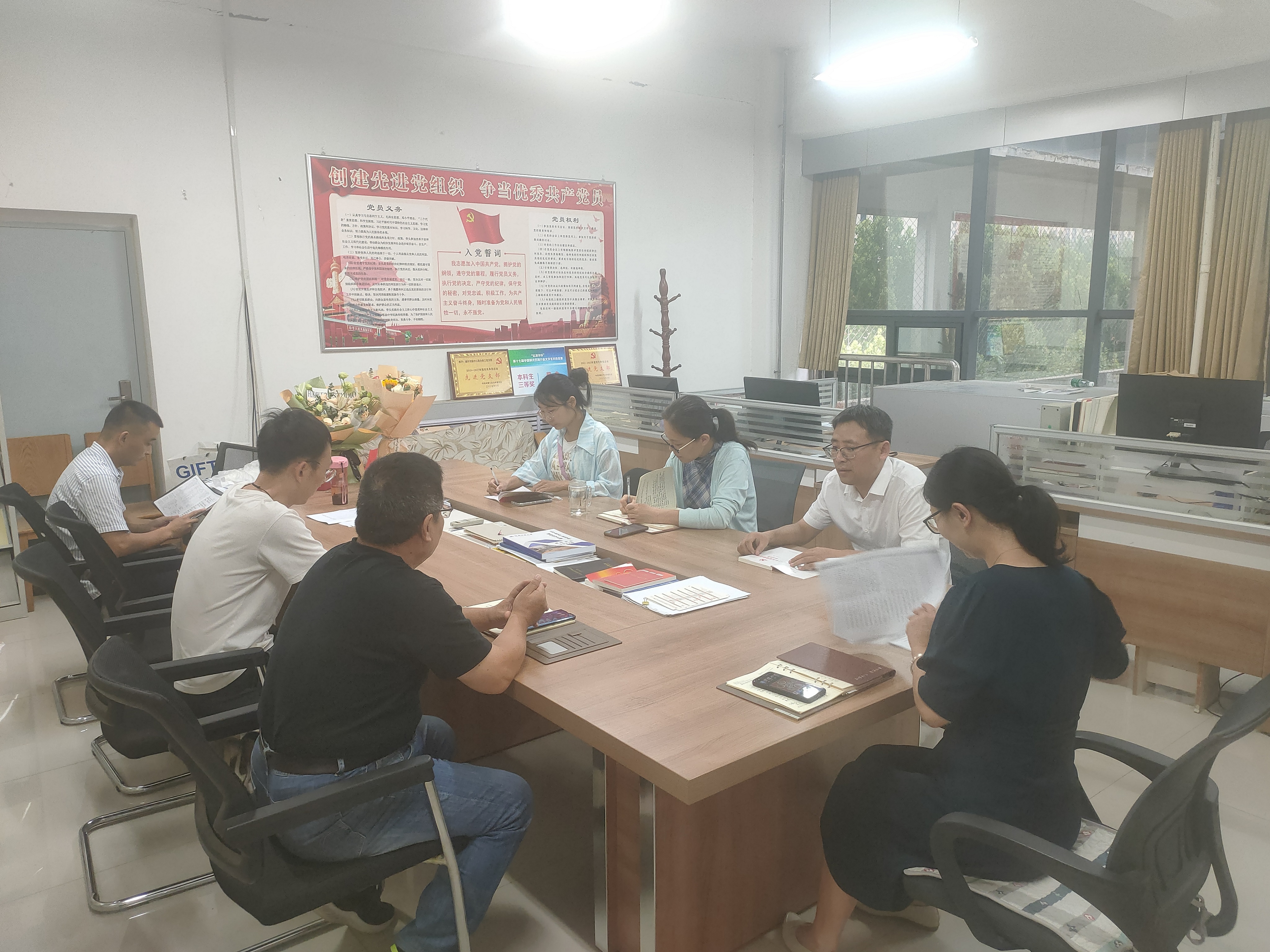 随后,王海霞领学《学习贯彻习近平新时代中国特色社会主义思想主题教育工作会议重要讲话》部分内容,毕文峰领学《中共中央关于在全党深入开展学习贯彻习近平新时代中国特色社会主义思想主题教育的意见》。支部各位党员同志紧扣主题,紧密联系个人思想和工作实际,深入查摆问题,明确努力方向开展批评与自我批评。
