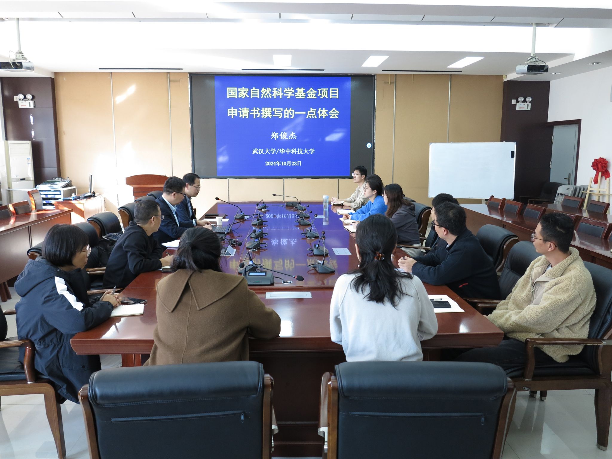 2024年10月23日下午,武汉大学/华中科技大学二级教授、博士生导师、教育部“长江学者特聘教授”郑俊杰应邀在a片网站 32208会议室为a片网站 师生作《国家自然科学基金项目申请书撰写的一点体会》专题讲座。院长丁永刚,学术副院长徐志军以及20多位教师参加了讲座,讲座由丁永刚主持。