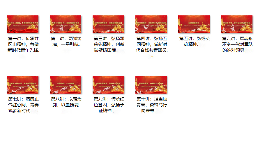 “传承井冈山精神,争做新时代青年先锋”,带领我们回望革命初期的艰难岁月,以井冈山革命先辈为镜,坚定理想信念,筑牢理想信念根基。“两弹铸魂,一星引航”,让我们走进新中国成立后的科技攻坚时期,领悟老一辈科学家自力更生、勇攀高峰的精神力量,树立以科技报国的远大志向。“弘扬邓稼先精神,创新破壁铸国魂”,聚焦邓稼先等科研工作者,传承他们隐姓埋名、无私奉献的精神,激励青年在新时代以创新为笔,书写强国篇章。“弘扬五四精神,做新时代合格共青团员”,以五四运动为起点,号召青年以五四精神为指引,着眼青年成长,提升自身素养。“弘扬英雄精神”,鼓励我们从众多英雄事迹中汲取力量,在平凡的岗位上坚守初心,践行使命。“军魂永不变——党对军队的绝对领导”,为我们阐释了军队听党指挥的重大意义,引导青年凝聚青春力量,支持国防事业,守护国家稳定与人民幸福。在个人发展与社会建设层面,“清廉正气驻心间,青春筑梦新时代”,将廉洁自律融入青年成长过程,以清风护航逐梦路之路。“以笔为剑,以血铸魂”,强调文字与思想的力量,鼓励青年用思想武器传递正能量,为时代发声,展现文字与思想的力量。“传承红色基因,弘扬长征精神”,带领吾辈重走先辈征途,深刻领悟艰苦奋斗、坚定信念的力量,百折不挠的奋斗精神。“担当励青春,奋楫笃行向未来”,则聚焦当下,号召青年学子将个人理想融入国家发展大局,以实干担当精神把青春融入国家发展浪潮。