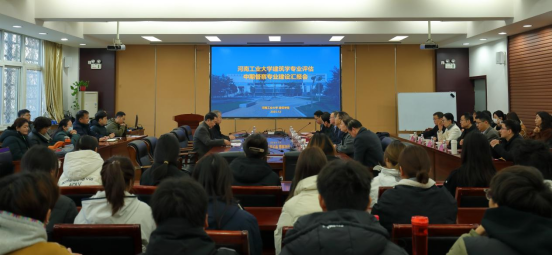院长丁永刚主持,副校长邓淼磊出席会议,教务处、人事处等职能部门负责人、学院负责人以及建筑学专业师生代表共同与会。会上,邓淼磊副校长首先致欢迎辞,对专家组的到来表示热烈欢迎。随后,李坤明老师围绕2023年评估视察报告所提意见,从专业概况、师资队伍建设、教学条件改善、课程体系优化等方面进行了系统汇报,重点展示了专业在粮油仓厂建筑和老龄化科技应对主动健康建筑等特色方向上的建设成效,以及2025年培养方案与课程体系的优化进展。