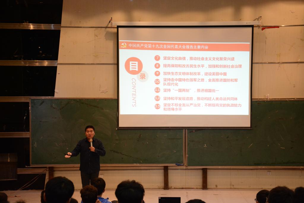 在32号楼201教室组织全体学生党员、学生骨干及第25期党课学员学习党的十九大精神。马克思主义学院形势与政策教研室主任丁建波为a片网站